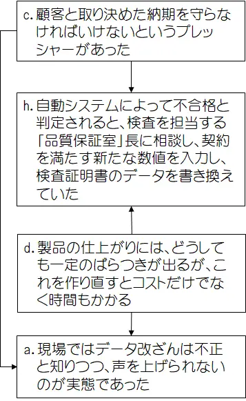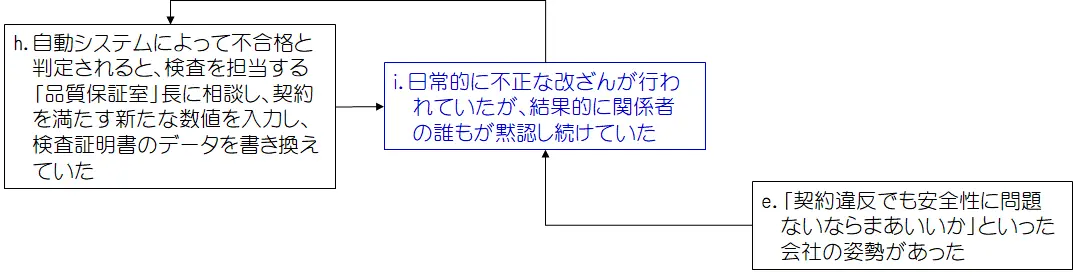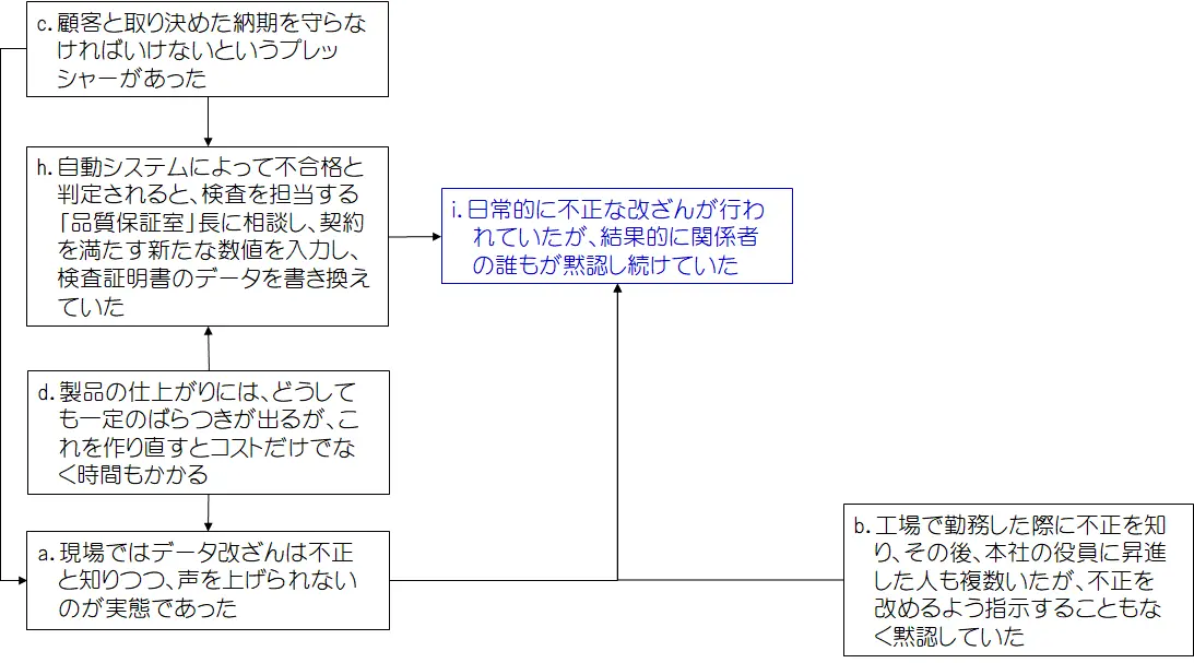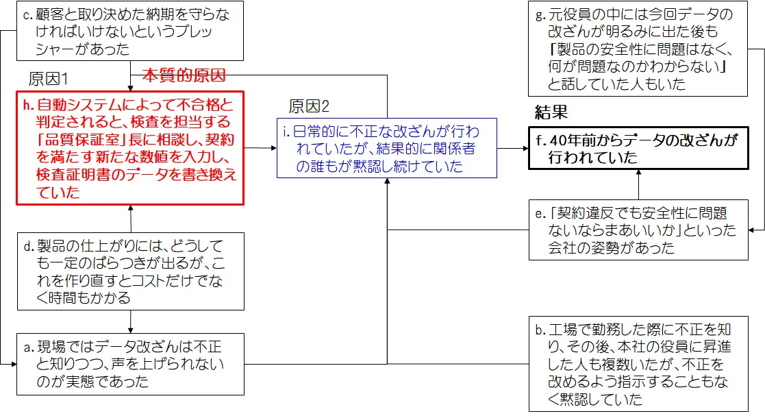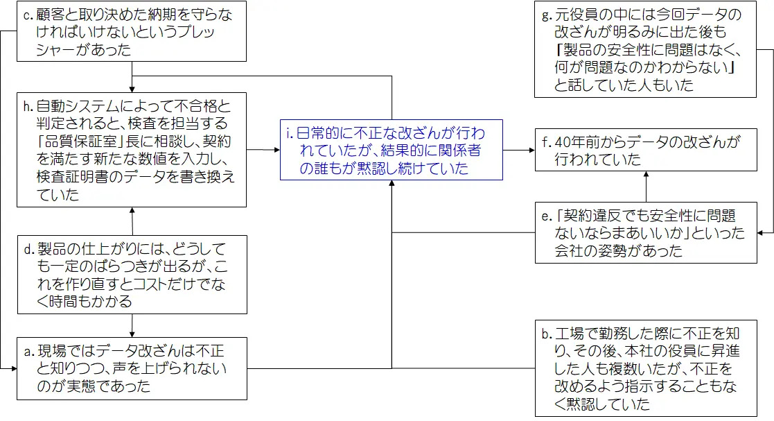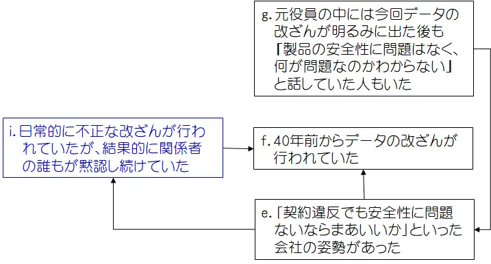 「i.関係者の誰もが黙認し続けていた」ことは「f.40年前からデータの改ざんが行われていた」という結果を招き、その上、「g.何が問題なのかと話す元役員」は「e.会社の姿勢」を下支えし、それが改ざん問題を際限のないものにしたということが考えられます。