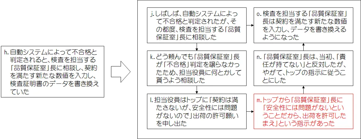 - 自動システムによって不合格と判定されると、検査を担当する「品質保証室」長に相談し、契約を満たす新たな数値を入力し、検査証明書のデータを書き換えていた