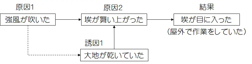 例えば、「強い風が吹いた」(原因)と「埃が目に入った」(結果)という事象の関係は、間接的な因果の関係と考えられますので、周辺事象を観察し、「埃が舞い上がっていた」、「大地が乾いていた」といった事実情報を、可能な限り補って、因果関係図を完成させるということです。