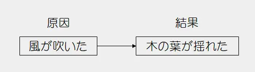 例えば、「風が吹いた」(原因)事象と「木の葉が揺れた」(結果)事象を例にして、これを、因果関係図として描きますと次のようになります。原因から結果に向けた実線の矢印(→)で繋がれています。